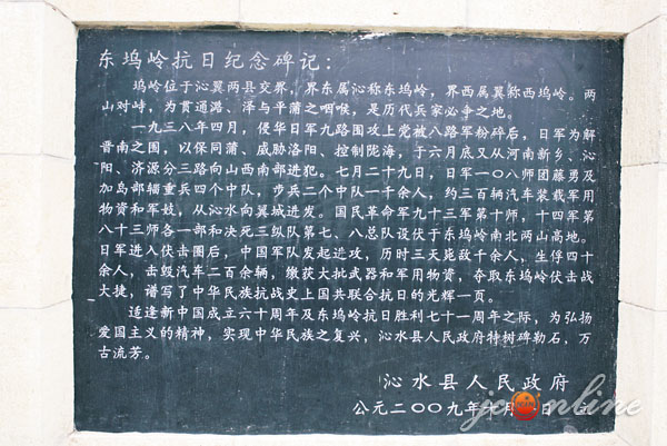适逢新中国成立六十周年及东坞岭抗日胜利七十一周年之际,为弘扬爱国主义精神,实现中华民族之复兴,沁水县人民政府特树碑勒石,万古流芳。